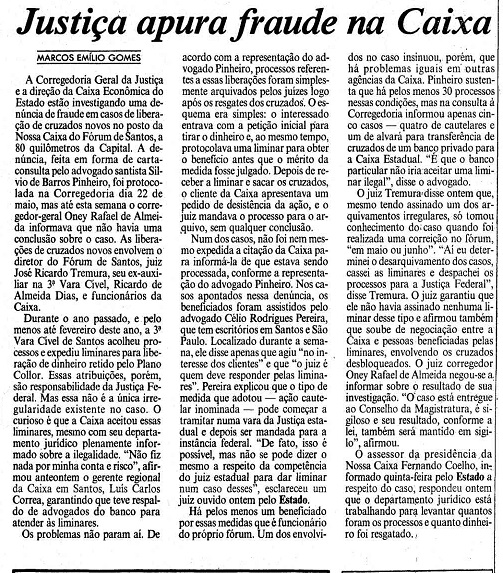 A Corregedoria Geral da Justiça e a direção da Caixa Econômica do Estado estão investigando uma denúncia de fraude em casos de liberação de cruzados novos no posto da Nossa Caixa do Fórum de Santos, a 80 quilômetros da Capital. A denúncia, feita em forma de carta-consulta pelo advogado santista Silvio de Barros Pinheiro, foi protocolada na Corregedoria dia 22 de maio, mas até está semana o corregedor-geral Oney Rafael de Almeida informava que não havia uma conclusão sobre o caso. As liberações de cruzados novos envolvem o direto do Fórum de Santos, juiz José Ricardo Tremura, seu ex-auxiliar na 3ª Vara Cível, Ricardo de Almeida Dias, e funcionários da Caixa.