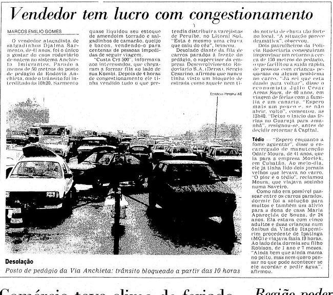 O vendedor atacadista de salgadinhos Djalma Sarmento, de 41 anos, foi o único a gostar do caos rodoviário de ontem no sistema Anchieta-Imigrantes. Parado a menos de 50 metros do posto de pedágio da Rodovia Anchieta, onde o trânsito foi interditado às 10h20, Sarmento quase liquidou seu estoque de amendoim torrado e salgadinhos de camarão, queijo e bacon, vendendo-o para centenas de pessoas impedidas de seguir viagem.