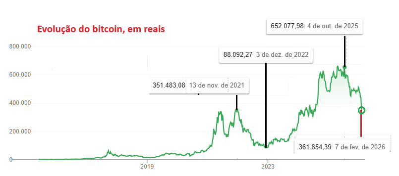 Em 22 de maio de 2010, programador Laszlo Hanyecz comprou duas pizzas na Papa John’s de Jacksonville, na Flórida, na transação que inaugurou o uso comercial do bitcoin. Pagou 10 mil bitcoins, equivalentes na época a US$ 41, ou R$ 76 reais pelo câmbio daquele momento. Pela cotação de 5 de outubro do ano passado, as pizzas custaram US$ 1,26 bilhão – ou R$ 6,7 bilhões. Em valores de hoje, seria possível comprar as mesmas pizzas de 2025 por metade do preço. O bitcoin acumula 47% de desvalorização desde sua alta máxima – e há risco concreto de que não vai parar por aí.